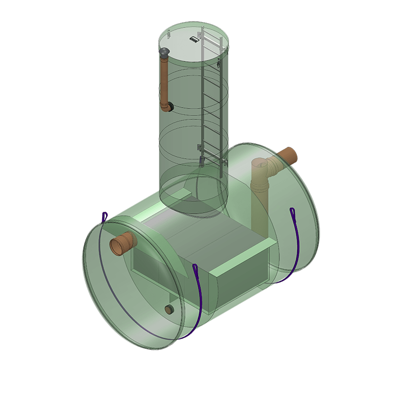 Бензомаслоотделитель представляет собой герметичный стеклопластиковый резервуар заводского изготовления со встроенными входными и выходными патрубками. Эксплуатационный колодец, предназначенный для эксплуатации нефтеуловителя, может изготавливаться различной высоты, в зависимости от глубины заложения канализационного коллектора по проекту. Колодец оборудован лестницей и имеет площадку для установки сигнального прибора. Конструкция горловины подразумевает возможность использования оборудования под проездами с тяжелой транспортной нагрузкой. Емкость на железобетонную плиту-основание на песчаной подготовке толщиной 200-300 мм в соответствии с проектной документацией.