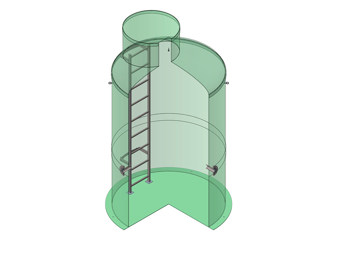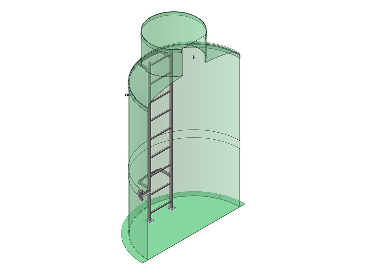 Вертикальный резервуар имеет диаметр 1 600 мм и высоту 6 100 мм. Объем емкости равен 12 кубическим метрам. Вес незаполненной емкости приблизительно составляет 600 кг, а вес полностью заполненной жидкостью – 12 000 кг.