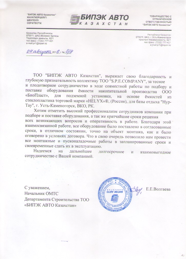 По заказу компаний ТОО "БИПЕК АВТО Казахстан" и ТОО «S.P.E.Company» завод БиоПласт изготовил и поставил накопительную емкость под торговой маркой HELYX. Резервуар для хранения технической воды предназначен для использования на горнолыжной базе отдыха Нуртау в Усть-Каменогорске (Казахстан). На данным момент проведен монтаж (подземная установка) и выполнены пусконаладочные работы.